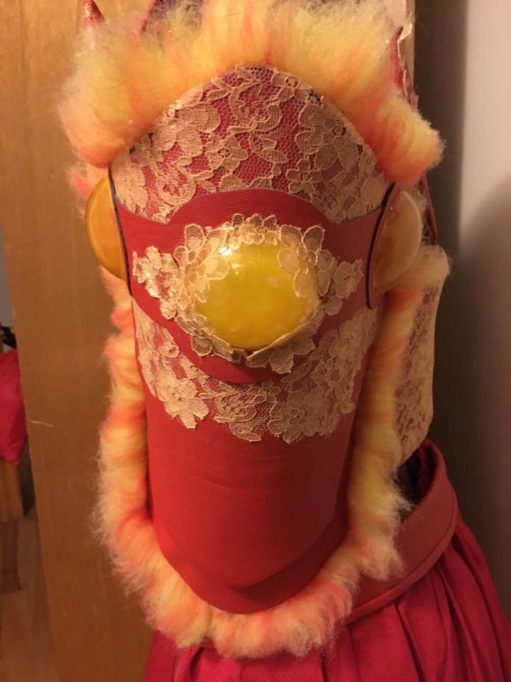 The tail is also dyed faux fur, which I DO NOT recommend. It takes the length out of the fur and ends up being hours of brushing it flat. But the golden color of Flareon’s tail was achieved so I’m happy with that. The faux fur garnishes were the scraps of gold leftover with hand-painted red flames that I added. I had to downsize my tail 3 times and it is still a little too big. I originally had it arranged so it hooked up inside my waist piece, but it was so heavy it stretched so I made a waist belt that I took in 3 times before it held well and solidly. I love my tail though. Flareon is all fluff and I really wanted to capture that.